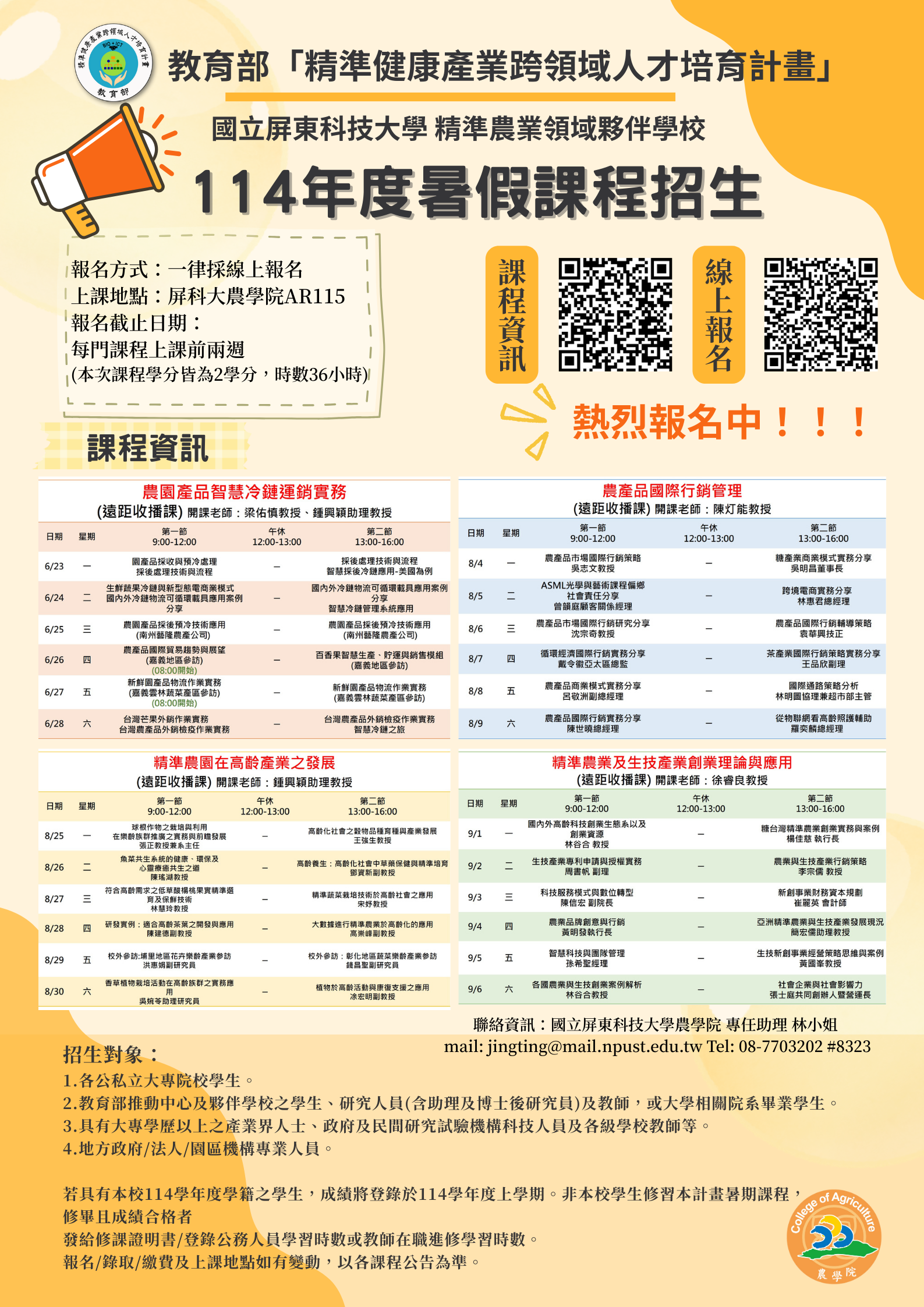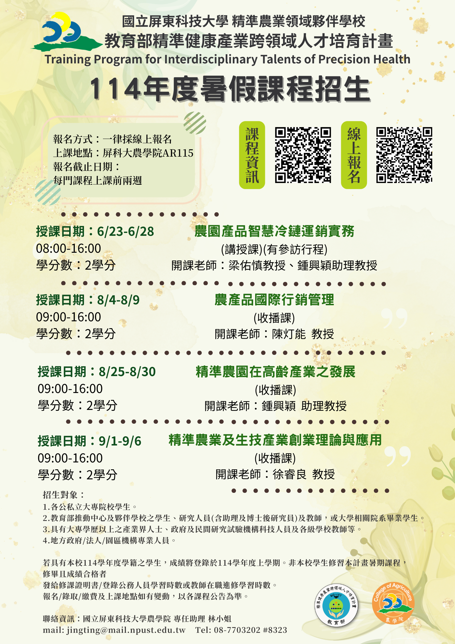 114年度開設多元課程,以本校農學院為主,輔以工、 管理學院等師資,搭配智慧農業與智慧養殖相關實習設施與場域, 並邀請具實務經驗業界教師參與課程設計與協同教學,與產、官、 學、研共同協力合作,規劃開授「農園產品智慧冷鏈運銷實務」; 另與中興大學合作開授三門遠距收播課程,包括:「 農產品國際行銷管理」、「精準農園在高齡產業之發展」及「 精準農業及生技產業創業理論與應用」, 強化農業人才多元化的學習與發展,加強產業職能, 期待透過此精準農業人才培育計畫,培育台灣新農業菁英。
